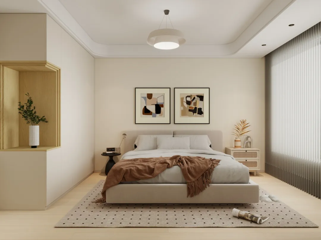 以纯净的白做底,搭配略显稳重的浅灰色与柔和富春山水色的木质元素做设计,色调协调温馨。整个空间都透着自然与柔和,每一处设计更是干净利落,生活在这一空间下自然而然地就会感受到静怡、舒适。 悬浮式吊顶搭配氛围灯带,增加空间时尚的柔和感;电视背景墙的曲线设计与凹凸立体视感的骊住长城墙板相搭配,将自然流畅的空间层次感渲染出来;柔软细腻的布艺沙发,搭配淡雅低调的浅灰色地毯,让客厅变成舒适慵懒的空间,让疲惫的身心在触及这一空间时,也变得轻松舒畅,这正是骊住定制为生活带来的舒适与美好。 空间产品信息: 电视柜:骊住定制收纳电视柜 浅灰色 墙板:骊住长城墙板 浅灰色 主卧室:静谧的舒适
