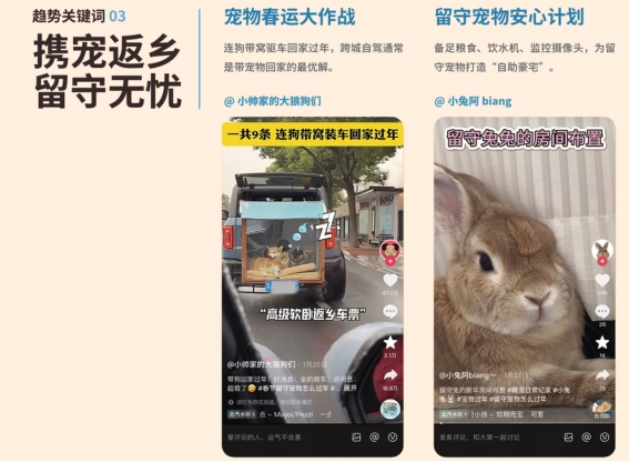 同时,家庭结构的变化让“毛孩子”成为团圆的一份子,携宠返乡、宠物专业护理等消费需求持续提升,智能设备让留守宠物的照料更安心,团圆的温暖,从未落下任何一个家庭成员。2025年春节期间,抖音达人@小帅家的大狼狗们 分享了带宠返乡的真实情况:好消息是此次带狗狗们过年返乡,乘坐的是房车,为出行提供了一定的便利;坏消息则是同行的狗狗数量较多,出现了超载的情况。视频以略带抽象又不失趣味的表达,道出了新年里养宠家庭带着毛孩子奔赴团圆、享受温馨时光的真实写照。