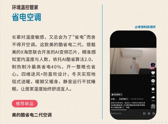 03 新年味好物,融于场景,暖于日常 年味的焕新,从来都离不开日常好物的温情托举。无论是亲情联结中的细腻关怀,年俗创新里的高效便捷,还是传统回归中的文化表达,每一种新年味的场景,都需要适配的好物来落地。抖音生活服务精心甄选各类匠心好物,摒弃生硬的清单罗列,将好物自然融入每一个新春生活场景,让每一份对新年的期许,都能转化为可触摸、可感知的生活美好。 亲情升级好物:以科技为媒,缓冲代际温情 亲情焕新的核心,是让关心不再流于形式,让陪伴不再受限于距离:长辈对温度敏感却总惦记省电,美的酷省电二代空调成为居家温控的贴心之选。依托美的AI酷省电算法2.0,制热制冷最高省电40%,开一整晚也无需担心能耗;四维送风搭配防直吹设计,冬天能实现地毯式送暖,暖脚又暖身,用科技守护长辈的冬日暖意。