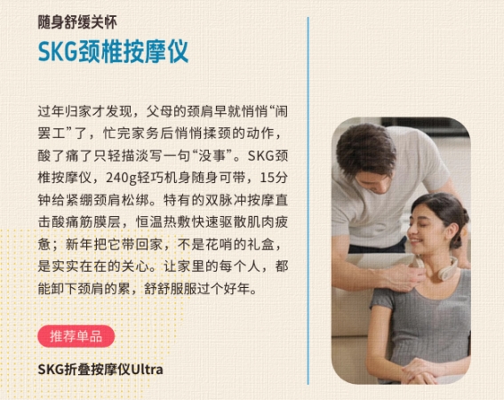 SKG折叠按摩仪Ultra等健康科技类产品,精准匹配“父母健康关怀”场景,以行业创新的可折叠轻量化设计和自研中频脉冲技术,将对家人的贴心关爱融入日常,成为春节情感礼赠品质首选。