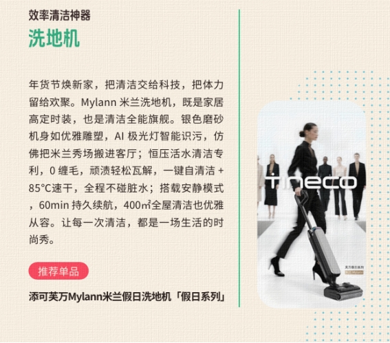 针对年末大扫除的核心需求,DREAME追觅智能清洁设备(如扫地机器人)助力“邪修式大扫除”,以科技提升家务效率,契合年轻人“花钱买时间”的消费趋势,为春节居家清洁提供高效解决方案。