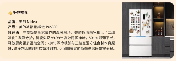 在年夜饭协作与家庭养生的场景中,美的熊墩墩Pro600冰箱等家电,支持“全家协作年夜饭”场景,以超薄平嵌、除菌净味、深冷锁鲜等功能,守护团圆家宴的新鲜与温暖。这些品牌好物,精准对接新春生活的核心需求,与年味场景深度绑定,成为“认真爱、用心生活”的重要载体。